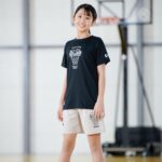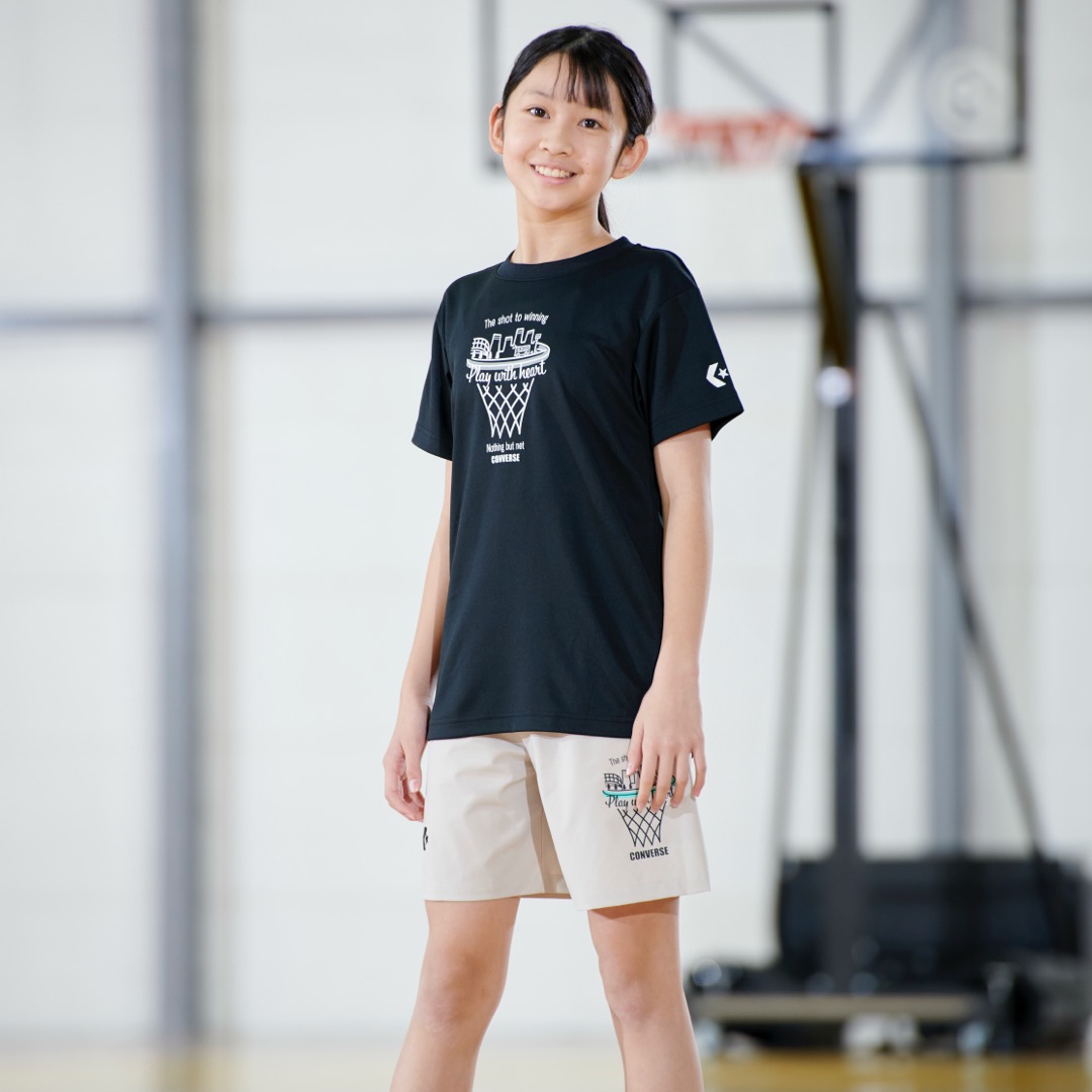 バスケットゴールリングに街を表現したデザインのジュニアTシャツ。撥水機能がありストレッチ性もある布帛の生地を採用したスポーツ向けアイテム。